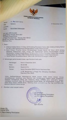Menurut sumber informasi yang diterima oleh Media ini, orang nomor satu di Kabupaten Bintan itu mendapatkan Surat dari Komisi Pemberantasan Korupsi (KPK) dengan Nomor R-1869/22/11/2019 untuk hadir pada Kamis, 5 Desember 2019 lalu, di Kantor Perwakilan BPKP Provinsi Kepulauan Riau untuk klarifikasi/dimintai keterangannya atas dugaan yang ditujukan kepadanya.