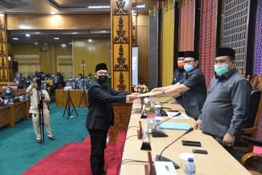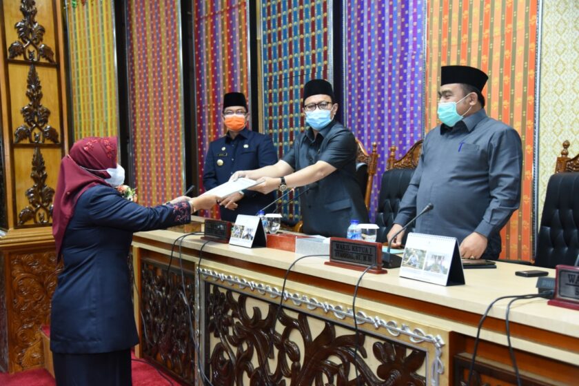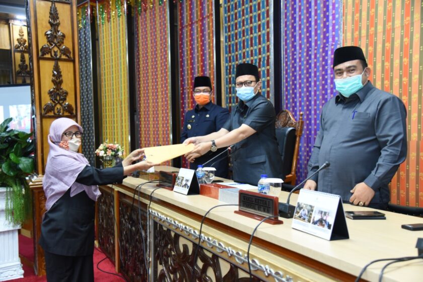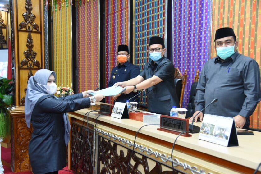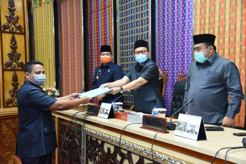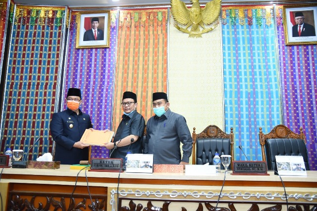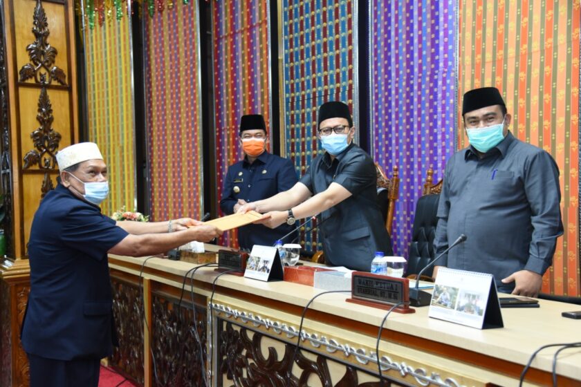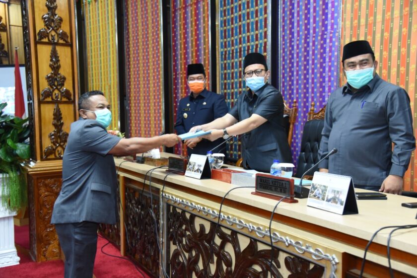 Diakhir Sidang, Pimpinan DPRD Kabupaten Bengkalis H. Khairul Umam, menyerahkan secara simbolis Laporan Reses Masa Sidang III Tahun 2020 kepada Pj. Bupati Bengkalis Syahrial Abdi. (Ricky).