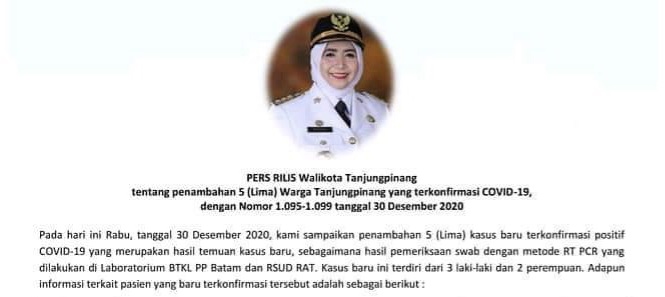 Tanjungpinang, GK.com – Kota Tanjungpinang kembali mencatat tambahan pasien positif Covid-19 sebanyak 5 orang pada Rabu (30/12) lalu.