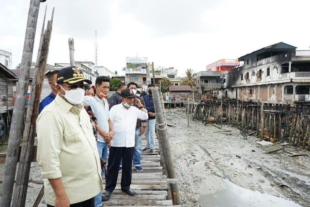 Karimun, GK.com – Bupati Kabupaten Karimun, Aunur Rafiq meninjau langsung lokasi kebakaran yang menghanguskan 6 rumah yang terletak di Pelantar Meral Kota.
