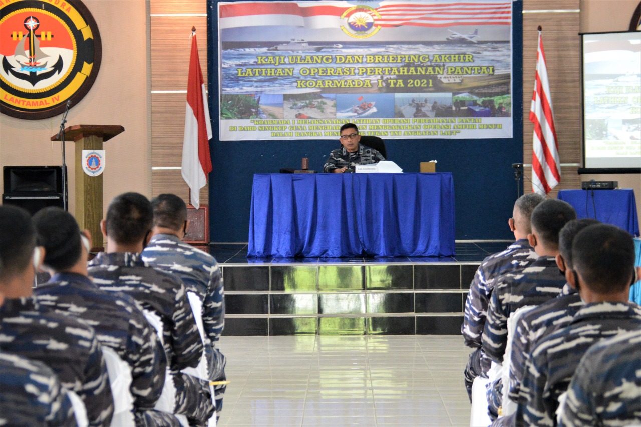 Bintan, GK.com – Kepala Staf Komando Armada I (Ks Koarmada I), Laksamana Pertama TNI Bambang Irwanto, M.Tr (Han) pimpin acara Kaji Ulang dan Briefing Akhir Latihan Operasi Pertahanan Pantai (Latopshantai) Koarmada 1 TA 2021 di Gedung Serba Guna Fasharkan Mentigi, Tanjung Uban, Jumat (16/4) pagi.
