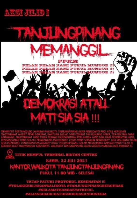 Tanjungpinang, GK.com – Rencana aksi unjuk rasa yang akan dilakukan oleh Aliansi Darurat Demokrasi Indonesia (ADDI) pada tanggal 22 Juli 2021 di Kantor Walikota Senggarang harus ditunda sementara waktu. Hal ini dikarenakan adanya pertimbangan dari masa Aliansi untuk menghindari terjadinya kerumunan pada saat Pemberlakuan Pembatasan Kegiatan Masyarakat (PPKM).