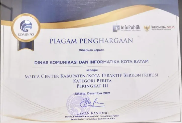 Batam, GK.com – Media Center Batam memperoleh juara III kategori berita dari Kementerian Komunikasi dan Informatika (Kemkominfo).