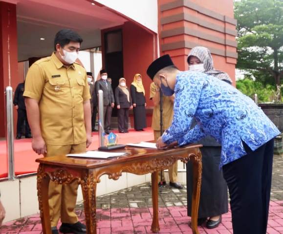 Bintan, GK.com – Pengangkatan dan Pengambilan Sumpah 140 PNS formasi Tahun 2019 serta penganugerahan Tanda Kehormatan Satyalancana Karya Satya kepada 324 PNS dilingkungan Pemkab Bintan dilaksanakan di Lapangan Aula Kantor Bupati Bintan, Senin (3/1/2022) pagi, dan dipimpin langsung oleh Plt Bupati Bintan, Roby Kurniawan dalam Apel perdana diawal Tahun 2022.