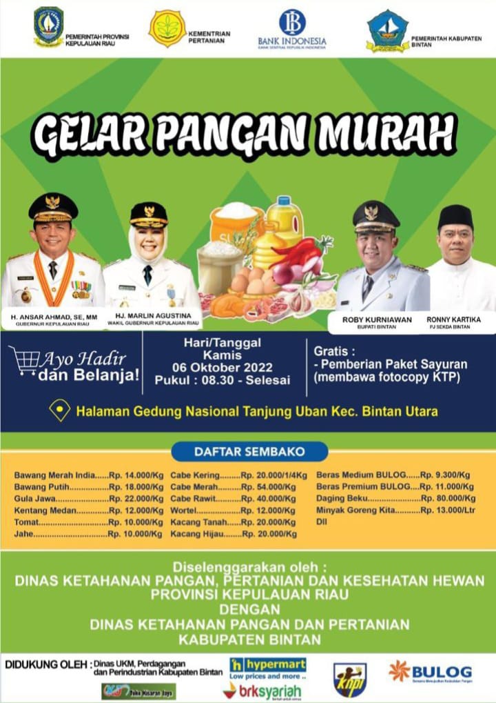 Bintan, GK.com – Meminimalisir dampak atas kenaikan harga Bahan Bakar Minyak (BBM) sekaligus sebagai upaya mengendalikan inflasi agar harga kebutuhan pangan tetap terjangkau, Pemerintah Kabupaten (Pemkab) Bintan melalui Dinas Ketahanan Pangan dan Pertanian (DKPP) akan mengelar pangan murah.