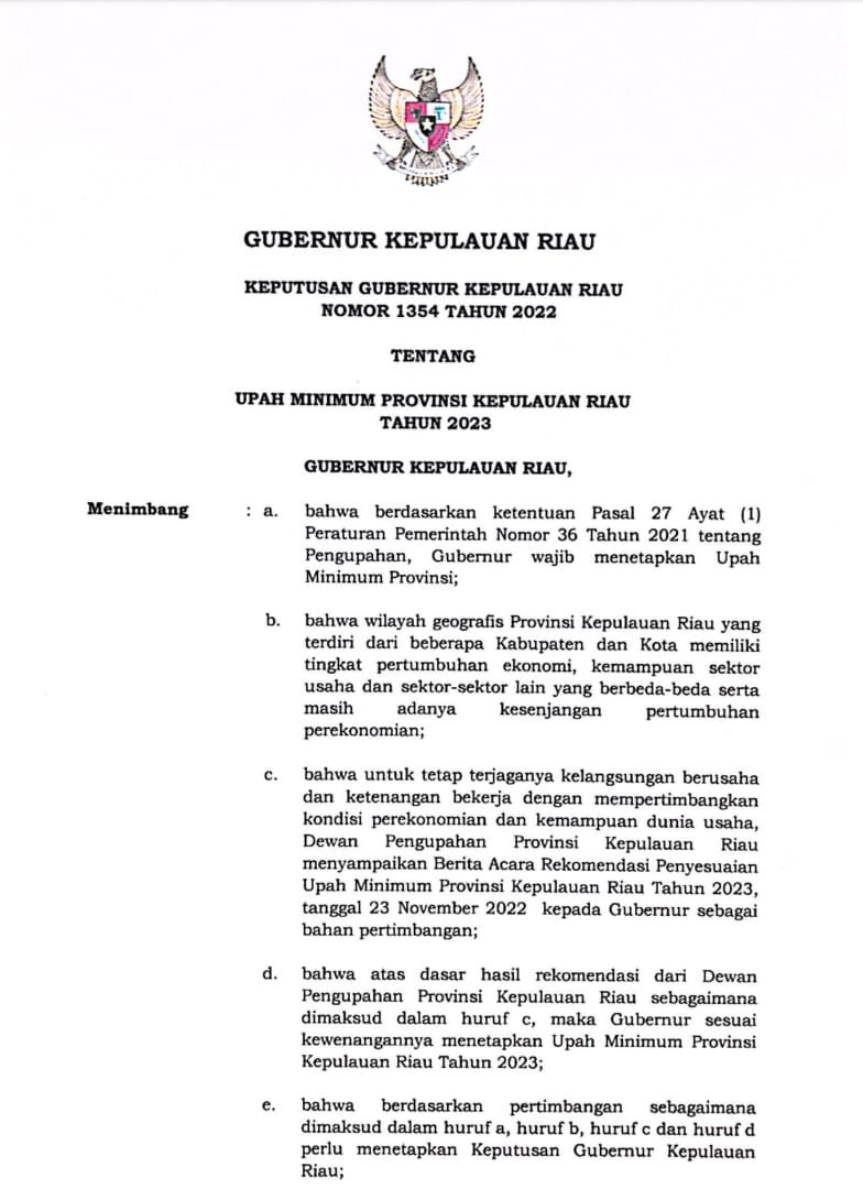 Penetapan UMP ini ditetapkan melalui Surat Keputusan (SK) Gubernur Kepri Nomor 1354 Tahun 2022 tanggal 28 November 2022 tentang Upah Minimum Provinsi Kepulauan Riau Tahun 2023, yang merujuk pada ketentuan Pasal 13 Ayat (1) Peraturan Menteri Ketenagakerjaan Republik Indonesia Nomor 18 Tahun 2022 tentang Penetapan