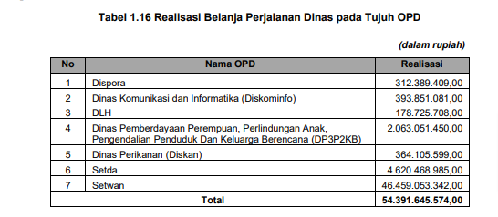 Pemko Batam TA 2023 menganggarkan Belanja Perjalanan Dinas sebesar Rp 83.501.352.619,00 dengan realisasi sebesar Rp 70.169.212.190,00 (audited) atau 84,03%. Realisasi tersebut turun dari TA 2022 yaitu sebesar Rp 5.544.251.238,00 atau 7,90%. Realisasi tersebut antara lain terdiri dari Belanja Perjalanan Dinas pada tujuh OPD. Hasil pemeriksaan atas dokumen pertanggungjawaban Belanja Perjalanan Dinas, konfirmasi secara uji petik kepada maskapai, hotel, Bendahara Pengeluaran dan pelaksana perjalanan dinas di tujuh OPD menunjukkan bahwa: