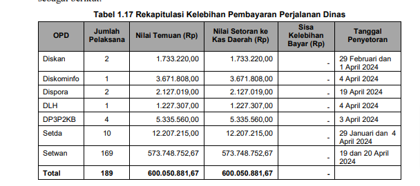 “Semua itu sudah ditindaklanjuti dan sudah dilakukan pengembalian sebagai bentuk pertanggungjawaban semua perangkat daerah tersebut,” ujarnya melalui pesan singkat pada Jumat, 2 Agustus 2024.