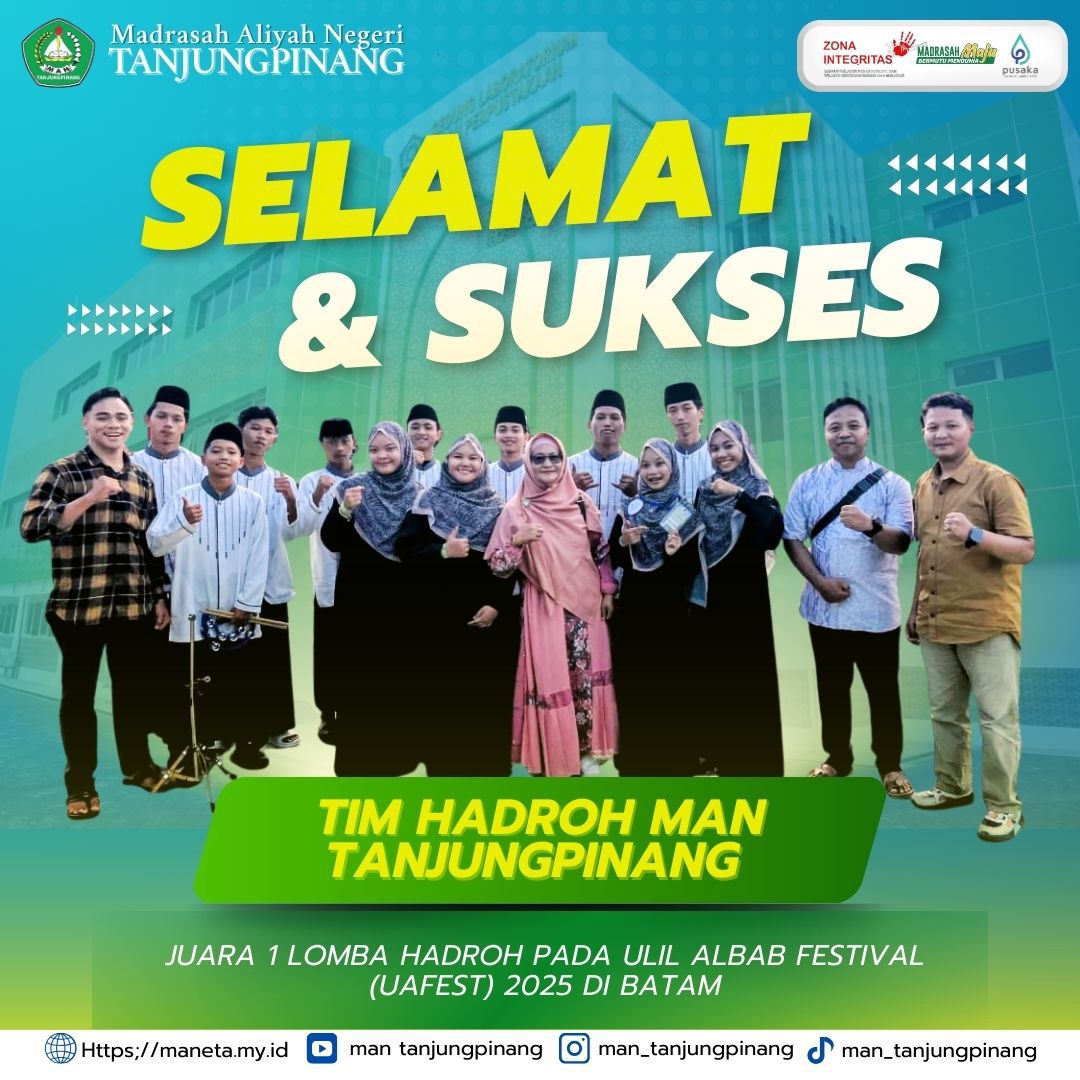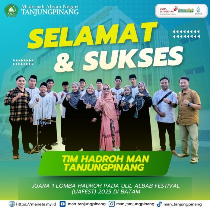 Tanjungpinang, GK.com – Prestasi membanggakan kembali ditorehkan oleh Madrasah Aliyah Negeri (MAN) Tanjungpinang. Selasa (7/9/2025), tim Hadroh Sekolah ini berhasil meraih Juara 1 Lomba Hadroh pada ajang Ulil Albab.